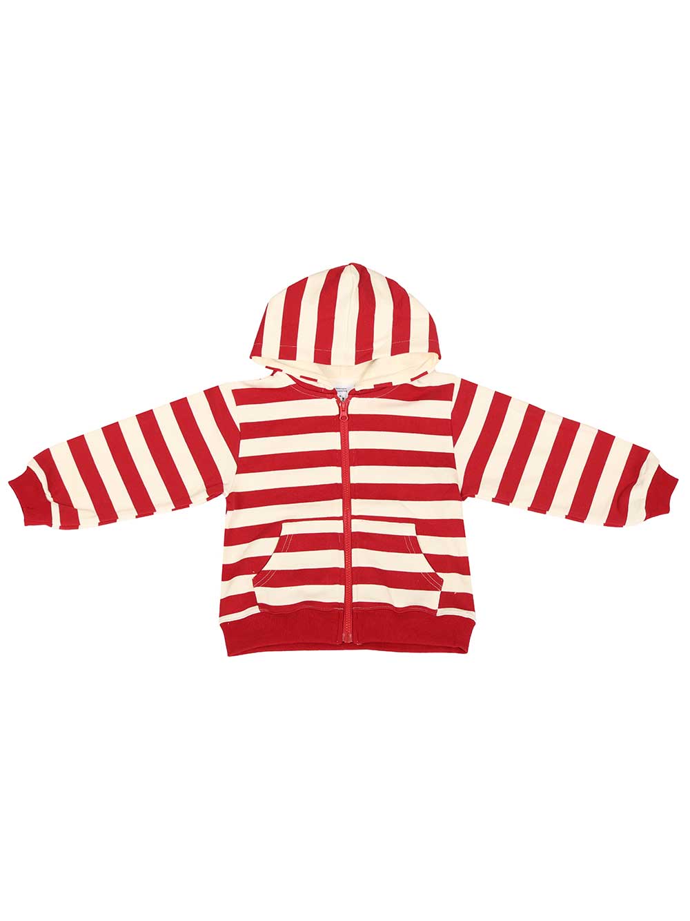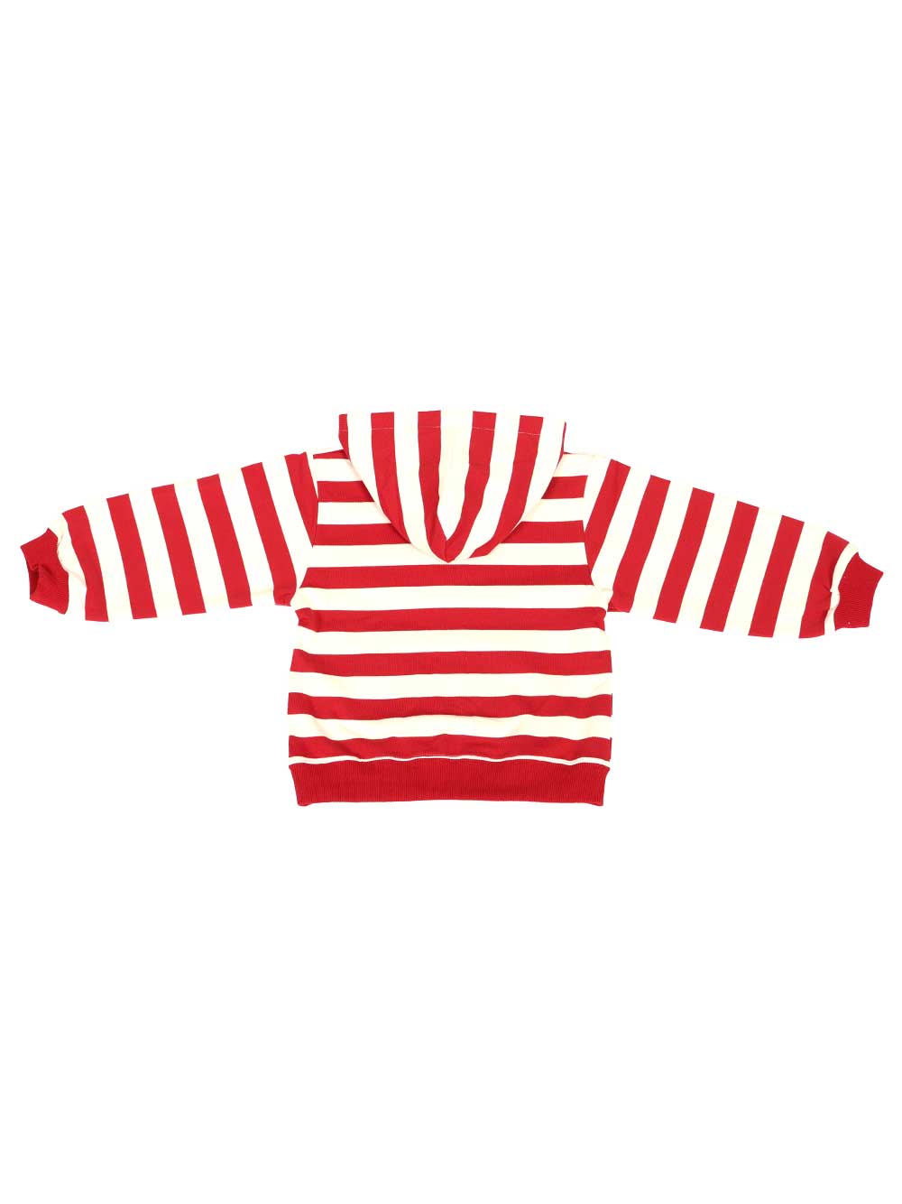 Felpa da bambino in jersey di cotone, morbida e traspirante, con iconico motivo a righe bianche e rosse, cappuccio foderato, chiusura full-zip e tasche frontali. Polsini e fondo a costine, pratici e piacevoli al tatto.